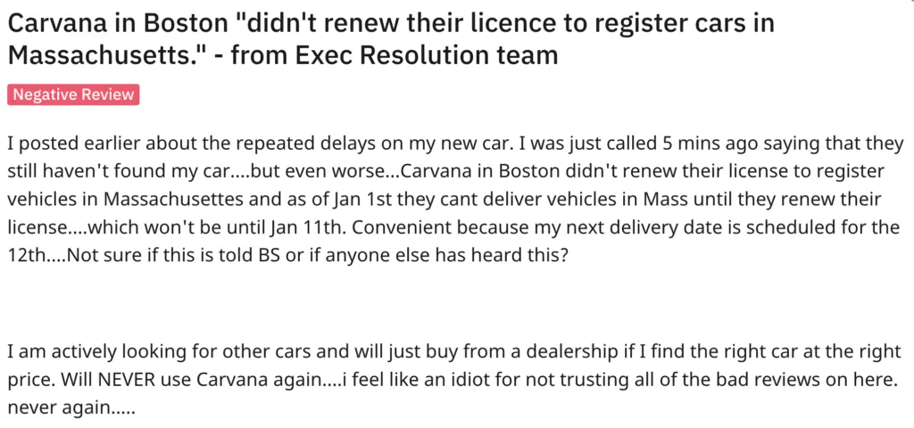 Take for example this experience documented on reddit from car buyer in Massachusetts. Carvana has struggled to maintain their dealer licenses in many states. If your dealer license lapses or is suspended you cannot legally sell vehicles. That’s exactly what happen in Boston, resulting in delays for customers.