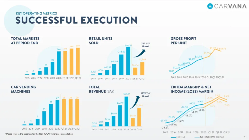 Carvana has grown very fast. In 2015 they sold just 6,500 vehicles nationally. In 2021 that number skyrocketed past 300,000. The company recently celebrated an impressive milestone; one million total vehicles retailed since their founding.