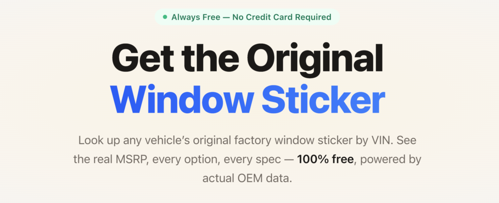 Hey Steven! I run WithClutch, and just to clarify some of your comments. The window sticker we generate is 50% of the time from the original OEM and IS the 100% the true to life Window Sticker. Some OEM’s don’t have the original PDF or records in their database so we recreate the label from the OEM build codes (Toyota brands, BMW, Mercedes Brands, GM). Hope this is helpful and just to clarify.