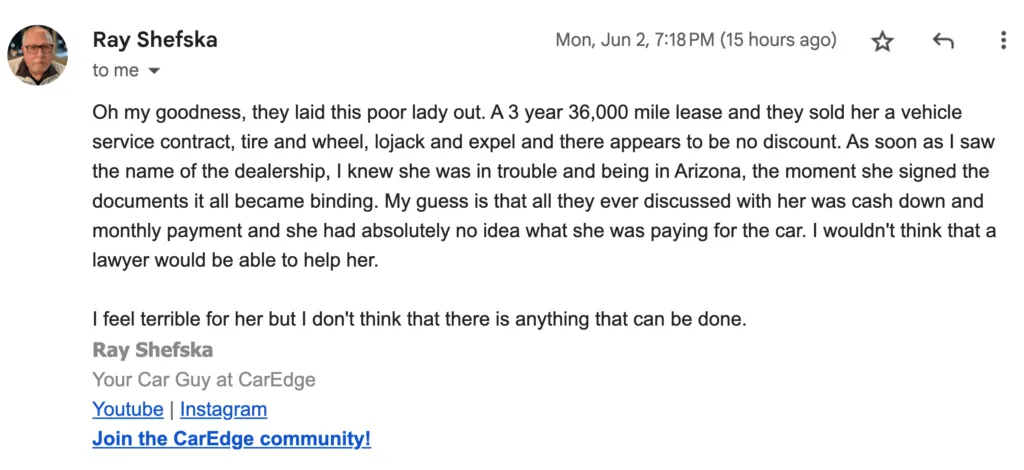 At CarEdge, we’re fired up. We’re prepared to do all that we can to help make this right for Adrianne if at all possible, and at the very least, to ensure that these deceptive practices stop. Far too many drivers have left the dealership lot feeling confused and taken advantage of. It’s long past due for that to change.