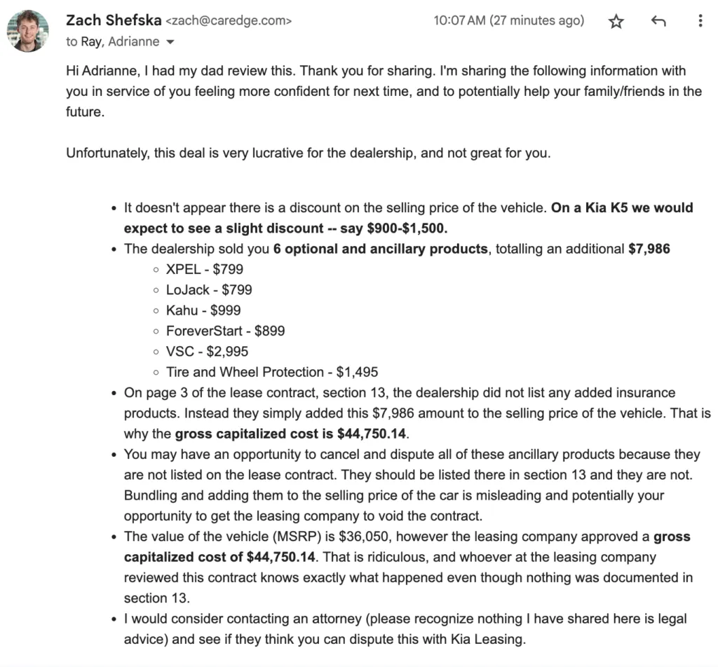 Where do we start? It’s easy to feel defeated after seeing all that was piled on to Adrianne’s deal. Here’s what truly makes this the Kia lease deal from hell, that NO customer should ever have to put up with: