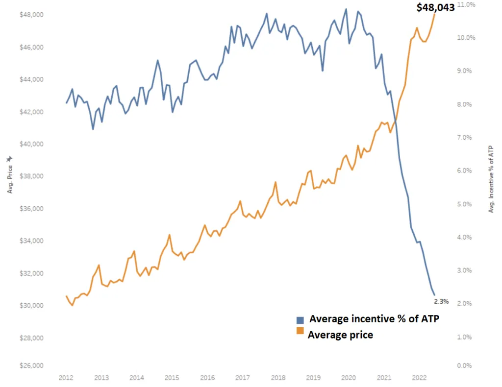 The industry average transaction price versus the industry average incentive as % of ATP. Source: Cox Automotive